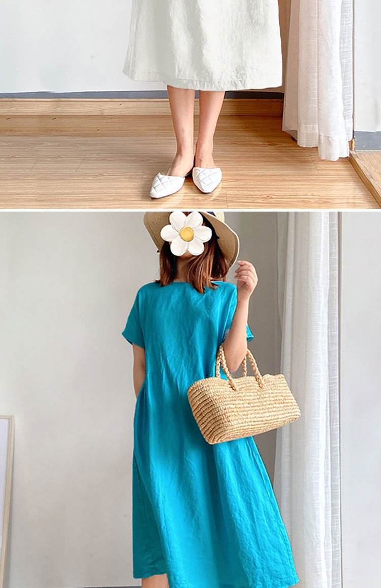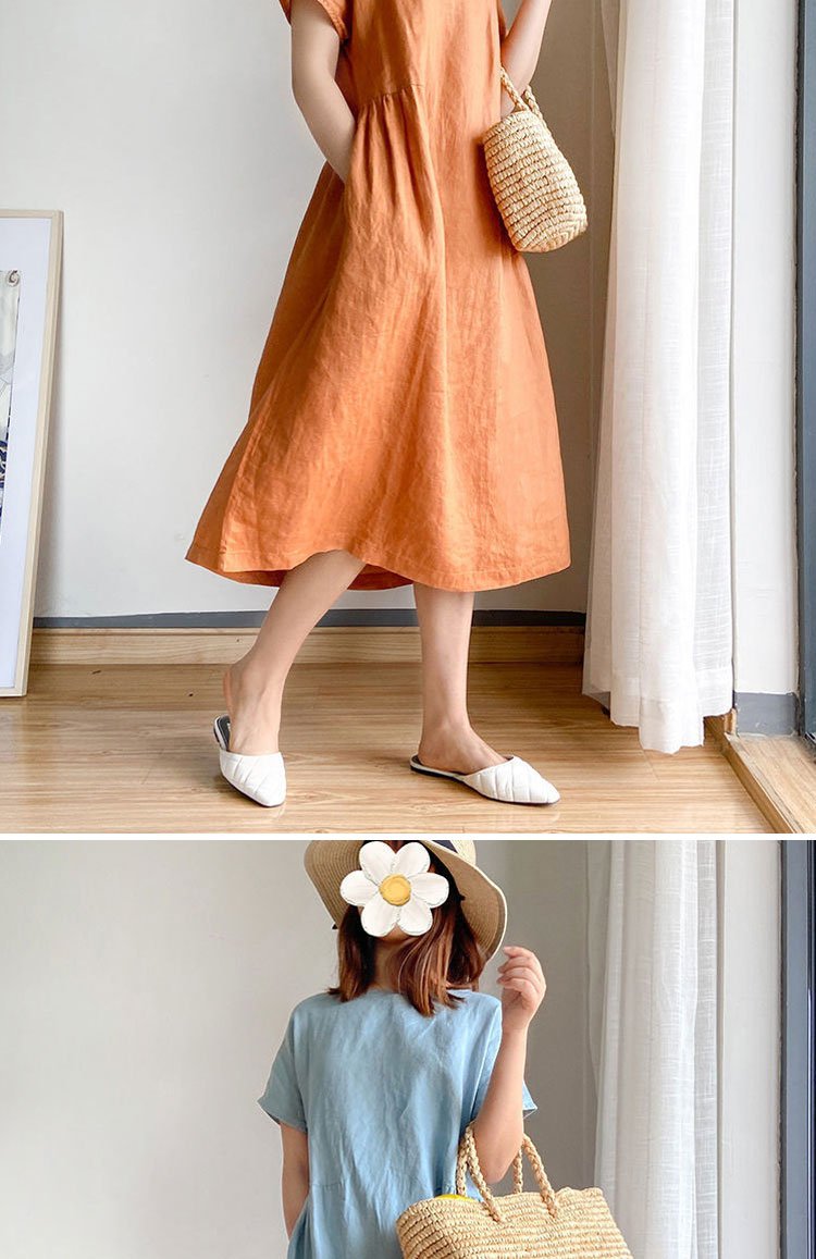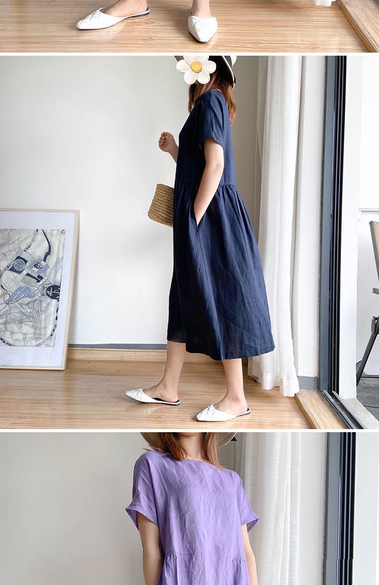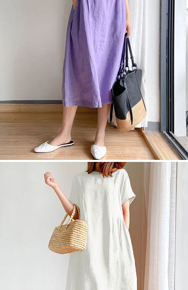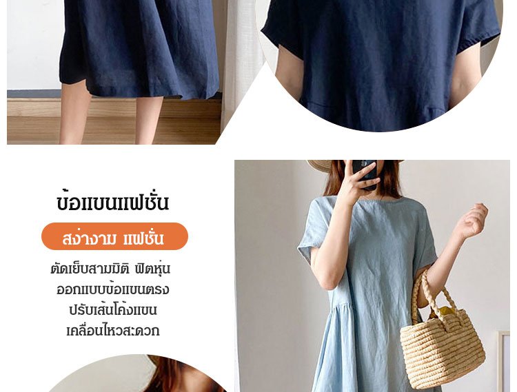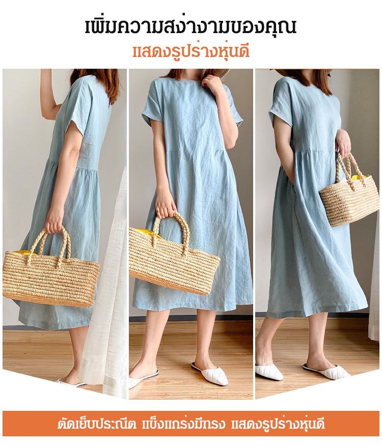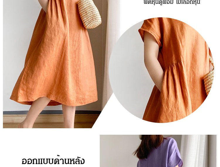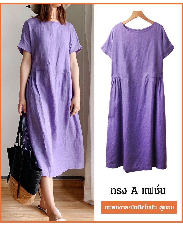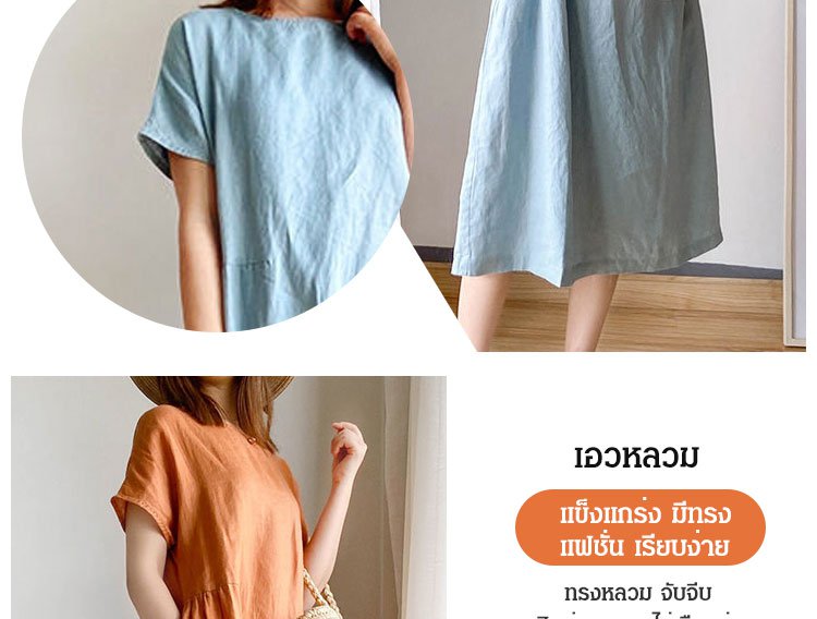ชุดเดรสผ้าคอตตอนลินินสีพื้นทรงหลวม